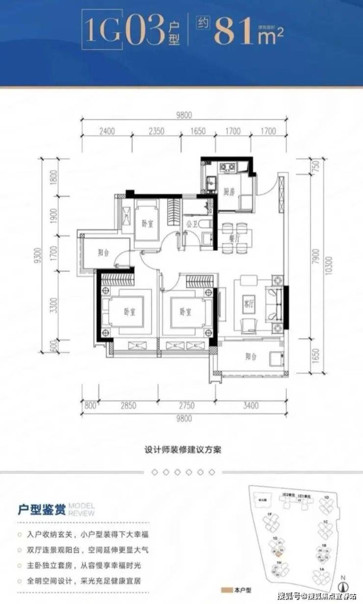 1G-03户型:约81㎡ 三房两厅两卫: