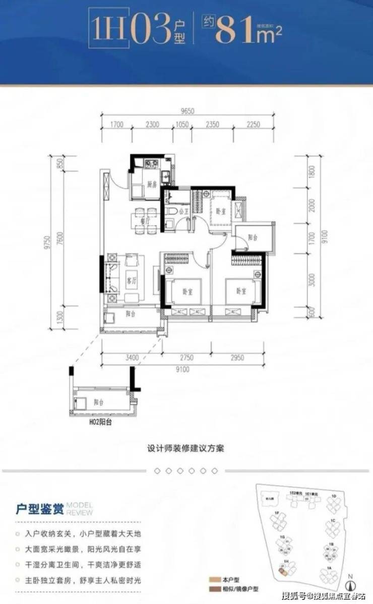 1H-02/03户型:约81㎡ 三房两厅两卫: