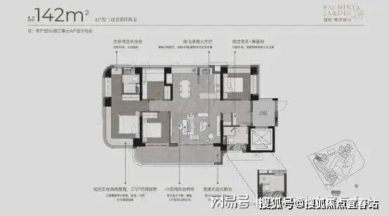 142㎡的4房2厅2卫,设计的是竖厅南北通透格局,专梯入户有独立公区,五开间朝南,主卧大套间无柱弧形270°转角飘窗,得房率约92-100%(包含赠送),西南/东南或东北朝向。