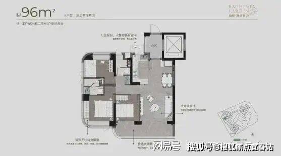 96㎡的3房2厅2卫,仅1栋2单元E户型,设计的是竖厅格局,三开间朝南,得房率约92-100%(包含赠送),西南朝向。