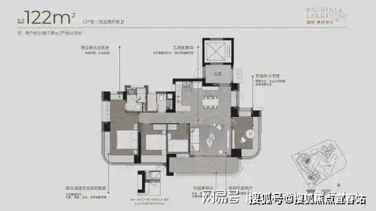 122㎡的4房2厅2卫,设计的是竖厅双龙抱珠格局,专梯入户有独立公区,五开间朝南,主卧大套间无柱弧形270°转角飘窗,得房率约92-100%(包含赠送),西南或东南向。
