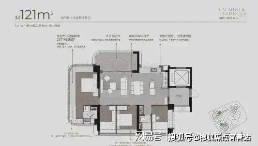 121㎡的4房2厅2卫,设计的是横厅南北通透格局,专梯入户有独立公区,主卧大套间无柱弧形270°转角飘窗,,得房率约92-100%(包含赠送),阳台主朝西南或东南向。