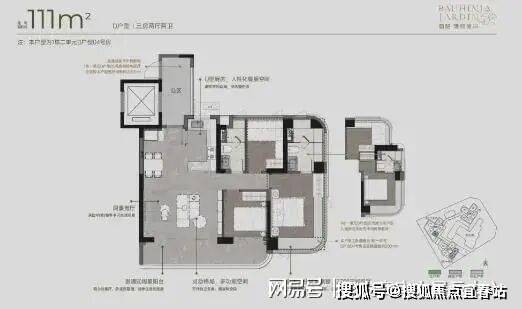 111㎡的3房2厅2卫,设计的是竖厅格局,三开间朝南,主卧大套间无柱弧形270°转角飘窗,得房率约92-100%(包含赠送),西南或东南朝向。