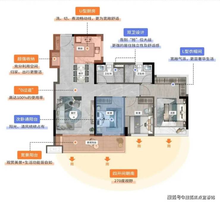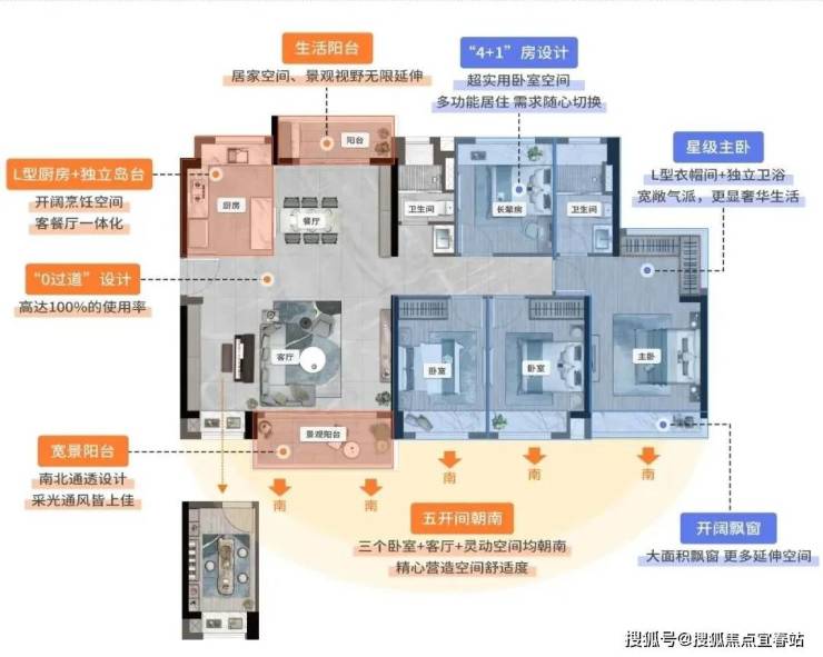 约14.8米的南向采光面,将阳光、园景纳入室内,映入眼帘。约127㎡4+1房户型,南向五开间,直接定格成一张“园景五连屏”。无论是在餐客厅,还是躺在房间,都能瞰景观园,感受满屏视觉盛宴。