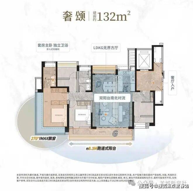 :奢厅入户,四开间朝南,搭配约6.15米阔景阳台及270°巨幕主卧飘窗,小面积实现大尺度采光;