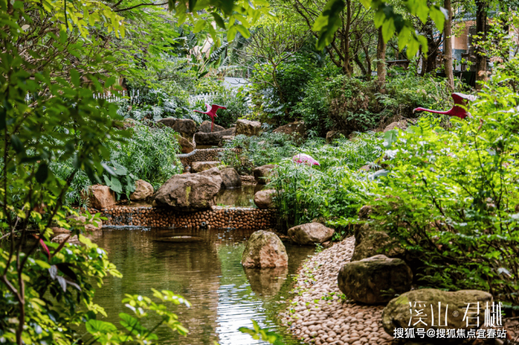 项目内部打造了一条沿着台地蜿蜒的溪流,该水系为市面罕见的活水溪流,贯穿整个社区园林,依据溪岸的曲直不同和地形变化,打造叠水、溪流、瀑布、水潭等多样特色水景,溪岸植物种类繁多,与水流互为风景,沿岸专门设置不同的亲水平台,营造自然灵动的栖心之境。