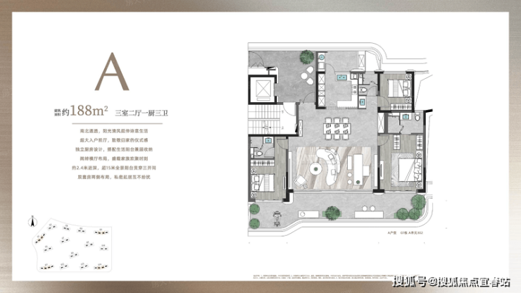 约 188㎡三室二厅一厨三卫:南北通透,超大入户前厅彰显归家仪式感,独立房带生活阳台,绰横厅布局,约 2.4 米进深、超 15 米全素用台贯穿三开间,双营两侧布局保障私密起居。