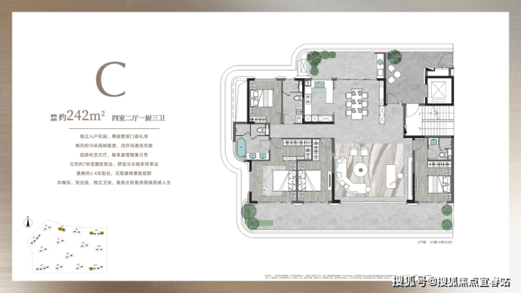 约 242㎡四室二厅一厨三卫:独立入户花园,尊崇质门屏礼序,南向约 19 米画宽四开间逐光而居,游社交方厅尽享度假日常,北向约 7 米宝藏型阳台舒适与功能兼具,挑高约 2.4 米阳台赏阅美景,衣帽间、双台盆、独立卫浴的主卧套房演绎非凡人生。