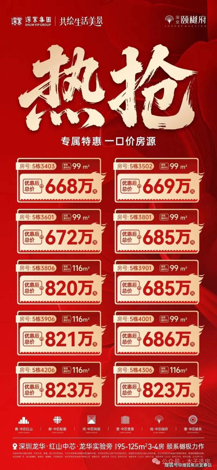 最新消息:红山最后的大花园社区准现房新盘——深业颐樾府最近推出了部分一口价房源,单价6.6万/平起,折后总价如下: