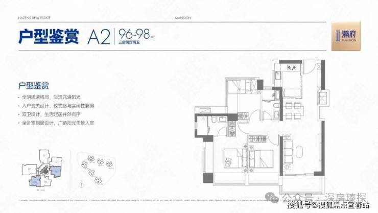 96-98㎡的3房2厅2卫,A2户型/2栋2单元03/06,设计的是经典竖厅格局,客厅3.5米开间,LDKB一体化,S墙设计预留冰箱卡槽位,动静分区,三开间朝南,主卧+1个次卧双飘窗,得房率约78%(不含赠送),U型厨房,卫生间干湿分离,西南或东南朝向。