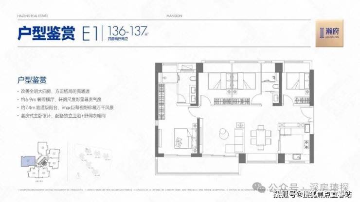 136-137㎡的4房2厅2卫,E1户型,设计的是横厅南北通透格局,客餐厅6.9米开间,LDKB一体化设计,四开间朝南,全屋7面飘窗,主卧套房+步入式衣帽间,3个次卧朝东北向,得房率约78%(不含赠送),U型厨房,公卫三段式干湿分离,客厅连接次卧出7.4米长的超大阳台,西南朝向。