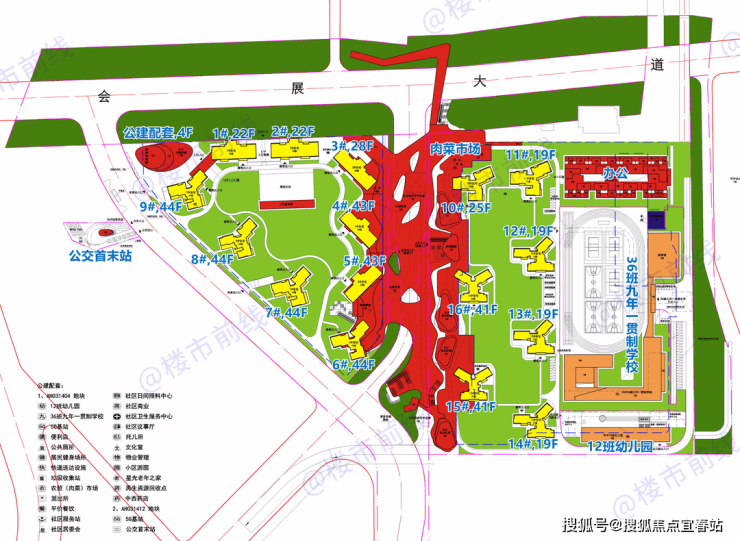 今年1月挂网的项目批后公布显示,其大致分为东、西两个部分,规划16栋19-44层高的住宅,西侧地块配有4层高的公建配套,东侧地块配有12班幼儿园、36班九年一贯制学校。两侧地块之间为商业配套,至于农贸肉菜市场、社区卫生中心、餐饮店、药店等配套也是有的。