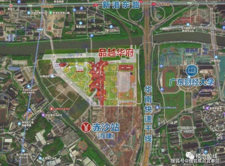 它位于赤沙涌以东、黄埔涌以南、苏沙西路以西地段,所在地块为规划地铁11号线赤沙车辆段上盖,总占地约21.2万㎡,计容建面约30.4万㎡。