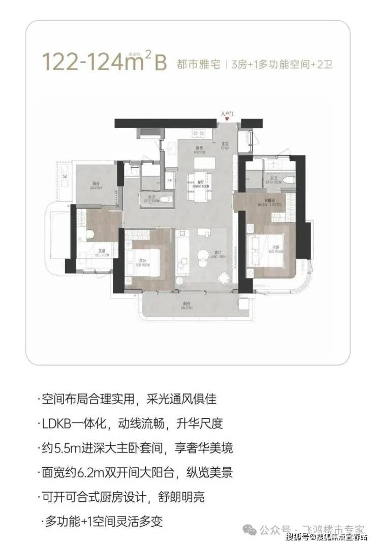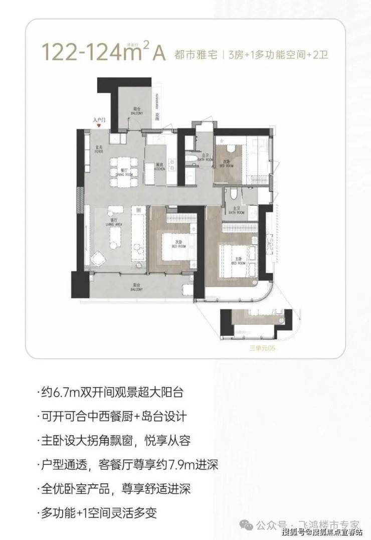 设计的是竖厅格局,客厅3.8米开间,LDKB一体化设计,三开间朝南,动静分区,分别做到了主卧13.78m²/次卧9.07m²/次卧8.1m²/次卧4.23m²(实测面积,去掉墙体),客厅连接次卧出6.7米长的观景大阳台,中西餐厨+岛台设计,公卫三段式干湿分离,得房率约71.7%(不含赠送),套内面积88.28m²,西南朝向。户型