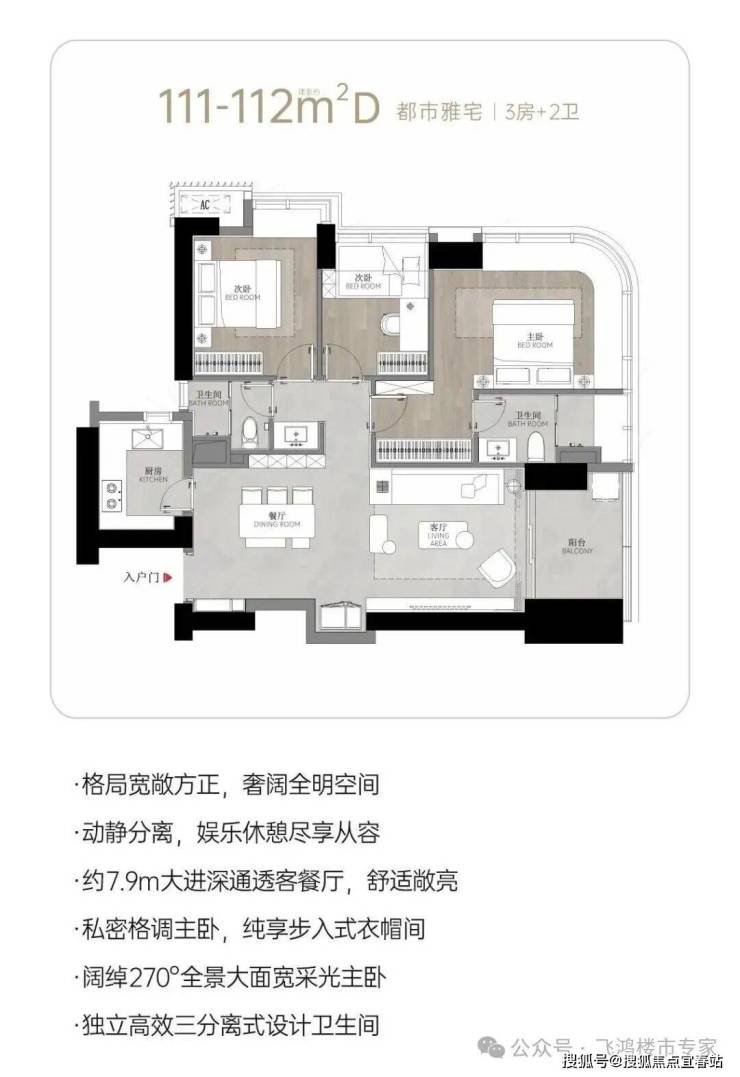 设计的是竖厅格局,客厅3.45米开间,LDKB一体化,S墙设计预留冰箱卡槽位,三开间朝南,动静分区,主卧270°全景大面宽采光主卧,分别做到了主卧13.1m²/次卧9.73m²/次卧7.02m²(实测面积,去掉墙体),U型厨房,公卫三段式干湿分离,得房率约71.7%(不含赠送),套内面积79.99m²,东南朝向。户型