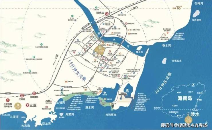 陵水地处北纬 18° 以南的 “珍珠海岸”,拥有 “三湾三岛一山一湖” 的自然景观。项目周边环绕着 10 万方商超、体育广场、文体中心、医院、星级酒店等,生活便捷舒适。