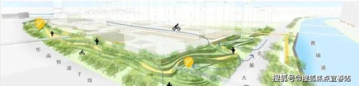 设计方案以“构建生态滨水社区、创新集聚枢纽综合体”为理念进行布局,打造世界级综合体。高度控制方面,项目主体建筑高度控制为125米以下,临近轨道站点地标建筑控制为不超过265米,满足白云山看珠江新城视廊的管控要求。将打造琶洲南部城市簇群,丰富城市天际线纵深层次,协同琶洲西区构建黄埔涌两岸城市对景。该项目南北向沿华南快速干线塑造了“万亩果园-赤沙片区-珠江新城”梯级抬升、峰谷起伏的天际线,东西向融入了珠江城市景观带天际线背景。地块总体呈前低后高的空间格局,向轨道站点核心抬升,形成集聚焦点。