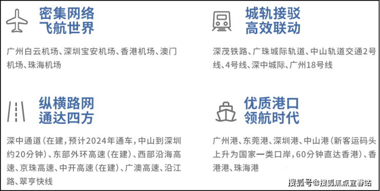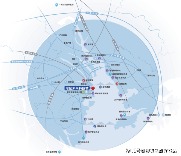 湾区未来科技城坐拥"一桥一港双站六轨道四快线"海陆空立体交通路网,1小时可通达珠三角5大国际机场和6大港口,深中通道约20分钟迅达前海,距深圳宝安机场仅约30分钟。只有交通便利,才有物流、人流的通畅,进而形成产业经济的综合效应。中山因其特殊的中心位置,“1小时圈”的物理距离具有非常大的优势,再加上深中通道的开通,将更加巩固中山作为湾区枢纽城市的地位,为企业提供更便利的物流通道和更低的物流成本。