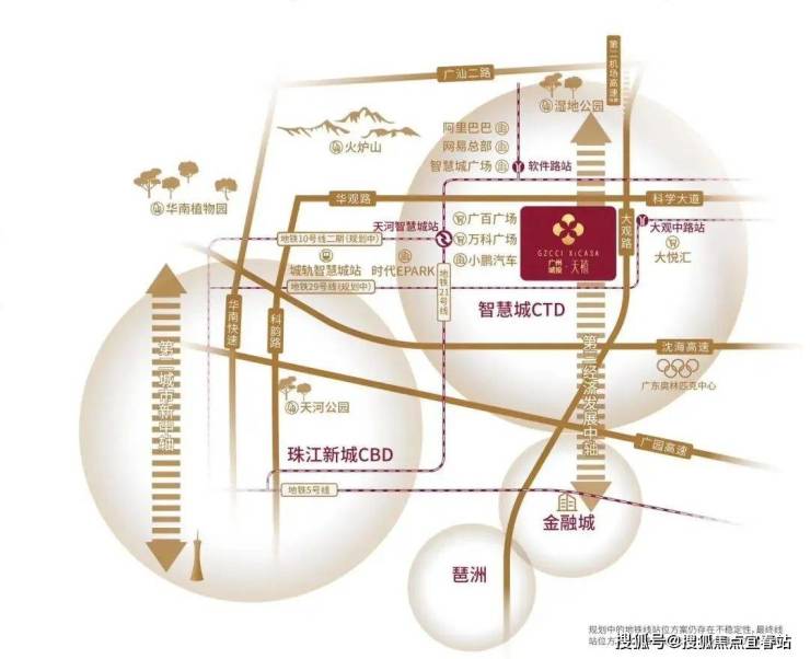 地铁方面,项目距离地铁21号线天河智慧城站直线距离800米,实际步行约1.4公里,需步行20分钟或骑行7分钟。该站为地铁快线,可3站到天河公园、6站到金融城、8站珠江新城,通勤效率较高。此外,未来还规划有地铁10号线、29号线,交通潜力较大。自驾方面,项目周边有科韵路、华南快速、环城高速等主干道,40分钟内可抵达珠江新城、琶洲、越秀等核心区。