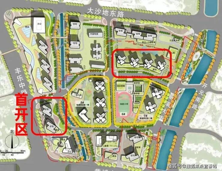 项目首开还是1、2栋,位于丰乐路和黄埔东路交界,1栋47层3T5,2栋31层2T5,分别有建面约86、95、115㎡三种全南向户型,使用率超100%。