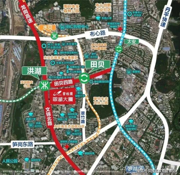 地理位置:水贝商圈;深圳市罗湖区翠竹街道田贝四路与文锦北路交汇处;距7号线洪湖站约89米,距3号线/7号线的换乘站田贝站约380米。
