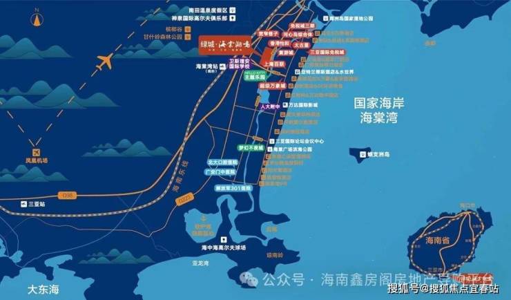 ·国家海岸海棠湾、蜈支洲岛旅游资源、万亩国家湿地公园、椰子洲岛、海中海高尔夫、老虎高尔夫学院;
