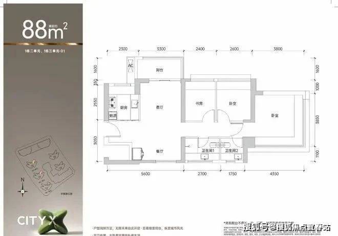 88㎡三房两厅两卫(双娃家庭置业首选):竖厅南北通透,四开间朝南,LDKB 一体化设计(客餐厨阳台联动)。亮点:主卧带 270° 无转角飘窗(采光面达 3.6 米),U 型厨房 + 双卫干湿分离,得房率约 90%(含赠送)。尺寸:客厅开间 3.3 米,主卧面积 15.63㎡(含飘窗),次卧分别为 7.54㎡和 6.96㎡。朝向:西北或东北向,部分房源可看园林景观。