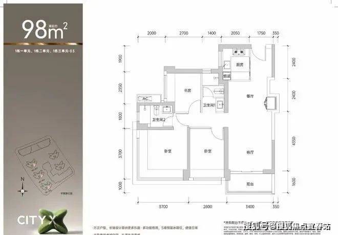 98㎡三房两厅两卫(舒居三口之家首选):经典竖厅设计,分为两种子户型:01户型:客厅开间 3.6米,东北朝向,全明采光。03/05户型:客厅开间3.4米,东南或西南朝向,三开间朝南,S墙设计预留冰箱位。亮点:主卧270°飘窗(采光面3.2 米),公卫三段式分离,得房率约 90%。尺寸:主卧14.3㎡,次卧分别为10.36㎡和6.75㎡。