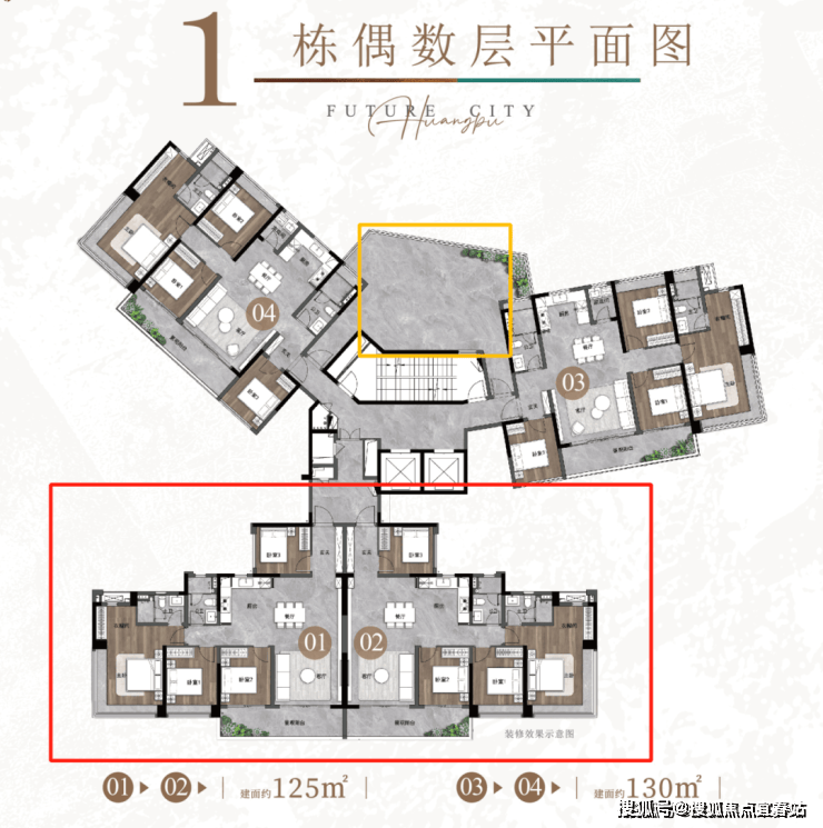 第二、买1栋奇数层,则125㎡和130㎡,四户人家,都有平台花园可以使用。