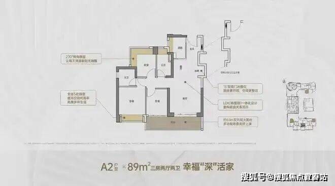 89㎡的3房2厅2卫,A2户型,设计的是竖厅格局,客厅3.5米开间,LDKB一体化,S墙设计预留冰箱卡槽位,客厅连接次卧出5.9米长的大阳台,次卧270度转角飘窗,U型厨房,卫生间干湿分离,阳台有朝西向、东向、南向。