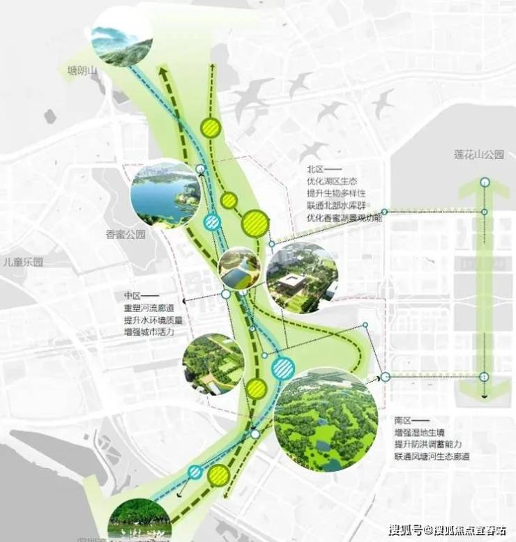 整个新金融中心分为北区、中区和南区,通过生态绿廊横跨红荔西路和深南大道,形成一个整片。