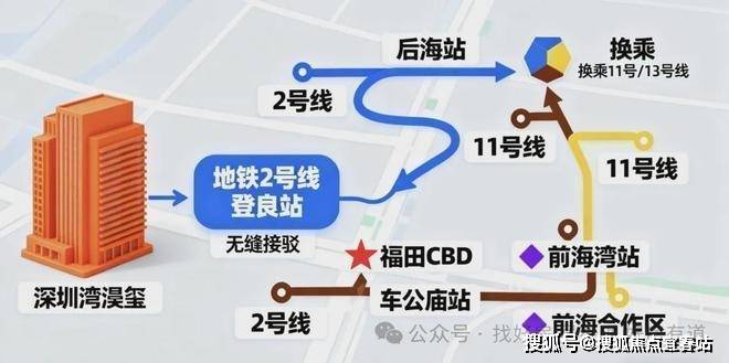 交通配套:项目无缝接驳地铁2号线登良站,1站可到后海站;1站换乘11号/13号地铁线,3站达福田CBD(车公庙站)、前海合作区(前海湾站)。