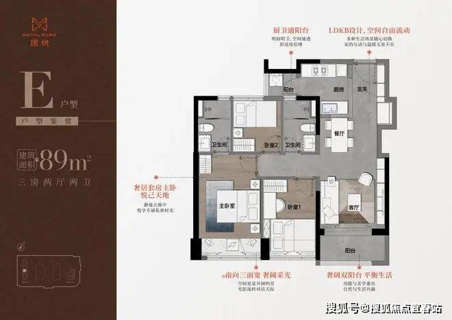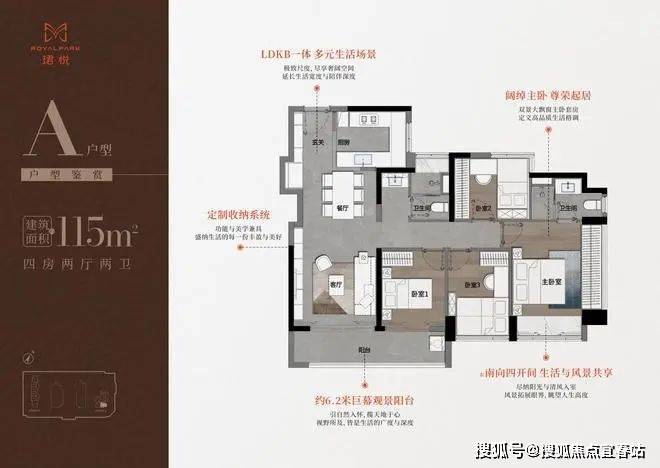 设计的是经典竖厅格局,进门入户玄关,LDKB一体化,S墙设计预留冰箱卡槽位,四开间朝南,动静分区,主卧双面飘窗,客厅连接次卧出6.2米长的巨幕大阳台,U型厨房,公卫三段式分离,得房率76.77%(不含赠送),套内面积88.71㎡,东南朝向,靓点是2个最小的次卧都不用睡飘窗。