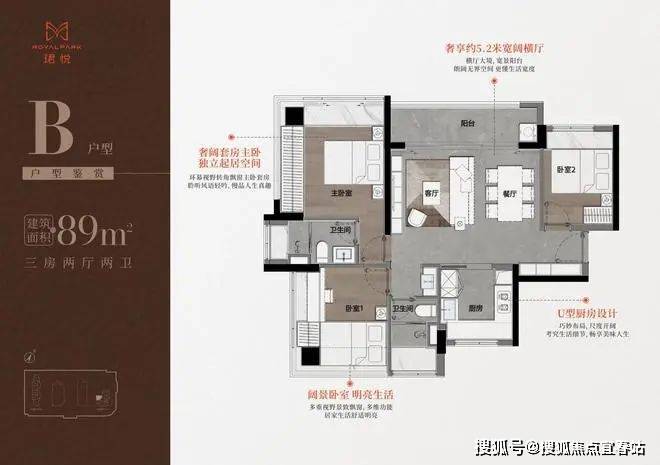 设计的是横厅南北通透格局,进门入户玄关,客餐厅5.2米开间,LDKB一体化,S墙设计预留冰箱卡槽位,三开间朝南,主卧+1个次卧双面大飘窗,客餐厅出5.2米宽景阳台,U型厨房,公卫三段式分离,得房率76.77%(不含赠送),套内面积68.95㎡,阳台主朝西北向。