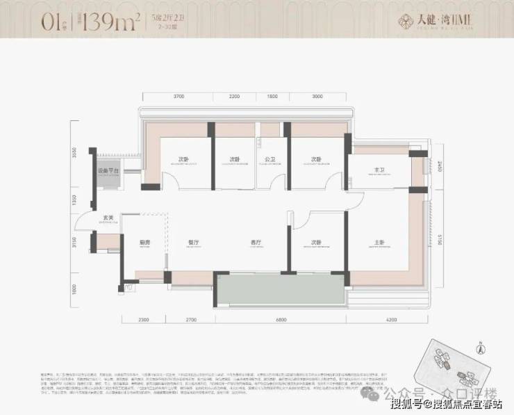 项目用地面积13657.28㎡,容积率仅2.8,建筑面积38155㎡,含住宅34555㎡,其他面积用于物业用房、托育机构和公交站,车位380个。户型产品为113㎡ 4房和139㎡ 5房 约290套,2栋100米内31层住宅,2梯4户,其中主力为113㎡ 4房,具体户新图暂未公布。