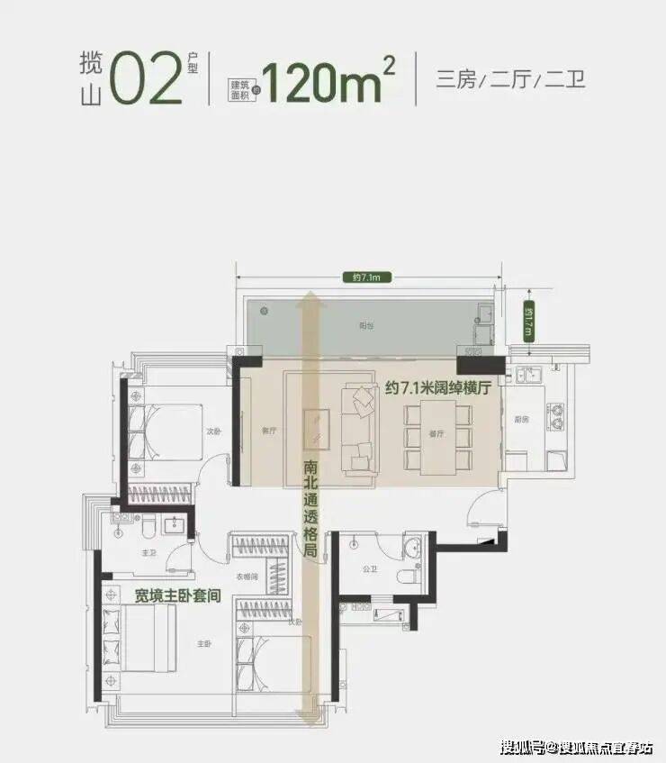 【全城追捧 揽山01/02户型】建面约120㎡ 3房2厅2卫约7.1米阔绰横厅,把山境尽揽入户