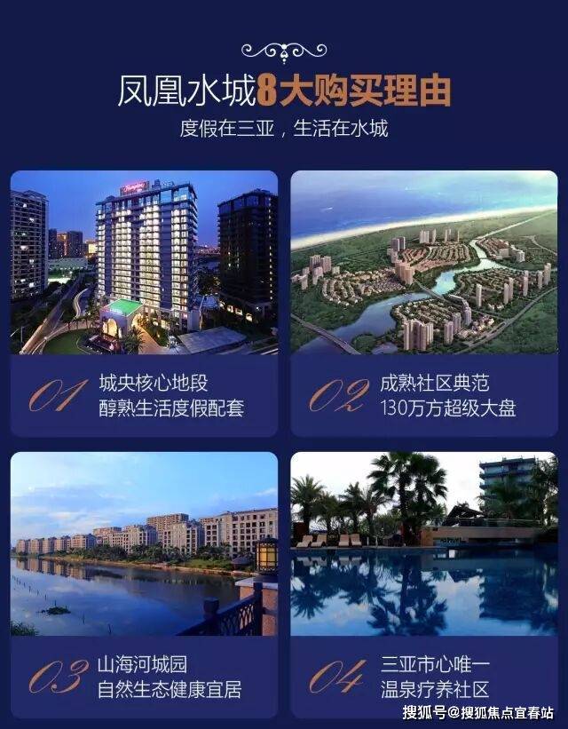 翠屏·凤凰水城,项目总投资逾200亿,占地3300亩,整体建筑面积近130万㎡,共分五个地块进行开发,目前已先后开发建成了ABCE四个片区,正在进行D区(凤凰海岸)项目开发,D区凤凰海岸项目总占地35.2万平方米,建筑面积约42.6万平方米,容积率1.21,绿地率37.02%,即推二组团总户数466户。总货值近200亿; 项目拥有17公里三亚湾椰梦长廊,依3公里城脉河三亚河湾,靠金鸡岭龙脉山,呈龙凤呈祥之秘境。