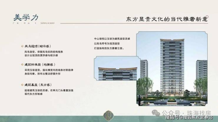 中山琅悦以玉琮为建筑造型灵感,以凤鸟符号为冠顶造型,打造独有的东方雅奢立面。