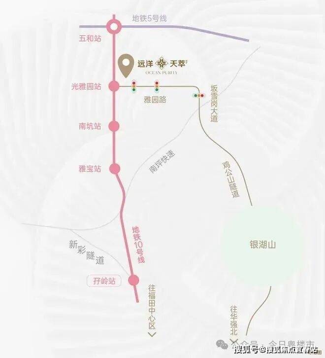 远洋天萃家门口就是“福田专线”——10号地铁线“光雅园站”B出口,1站到五和枢纽站,可换乘5号地铁线/深大城际,3站可到龙华深圳北站,3站到福田、4站到南山。