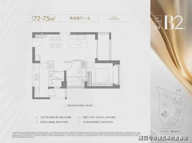 72-75㎡的2房2厅1卫,设计的是竖厅格局,客厅3.2米开间,LDKB一体化设计,进深7.2米,一字型厨房还带1个生活阳台,卫生间三段式分离,得房率约72.28%(不含赠送),西南、东南或东北朝向。