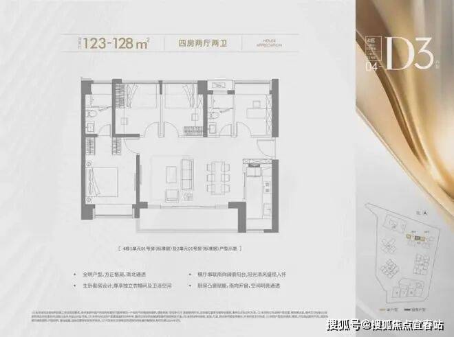 123-128㎡的4房2厅2卫,设计的是横厅南北通透格局,进门入户玄关,客餐厅6.6米开间,LDKB一体化设计,四开间朝南,主卧套房设计,6.6米超长观景阳台,U型厨房,卫生间干湿分离,得房率约72.45%(不含赠送),阳台主朝正南向。