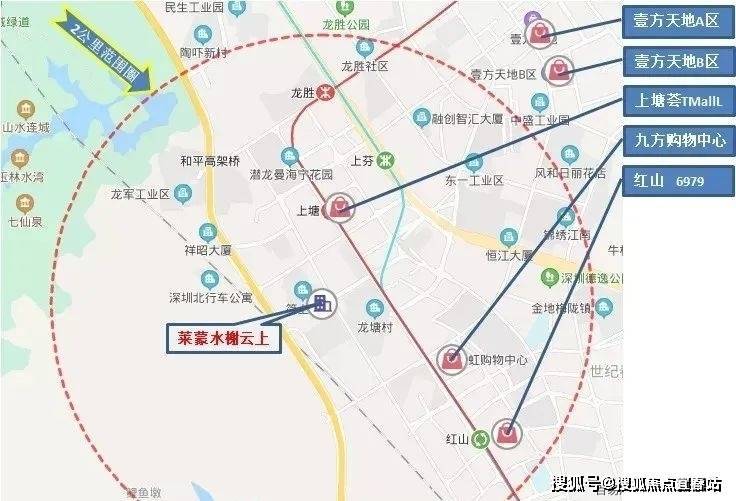 项目2公里范围内目前现有的大型集中式购物中心有上塘荟TMAIIL、九方购物中心(天虹购物中心)、红山6979商业中心等。不过这几处商业距离项目都稍远,步行会耗时过长,也不比较累,缺少了一些便利性。