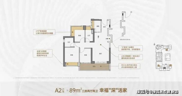 A2户型-约89㎡3房2厅2卫:户型分布在1、2、5单元,阳台南向、东向、西向均有选择。