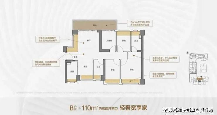 B户型-约110㎡4房2厅2卫:户型分布在1、2单元,竖厅南北通透格局。