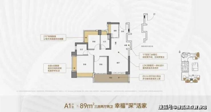 A1户型-约89㎡3房2厅2卫:户型分布在1、2、5单元,阳台南向、东向、西向均有选择。