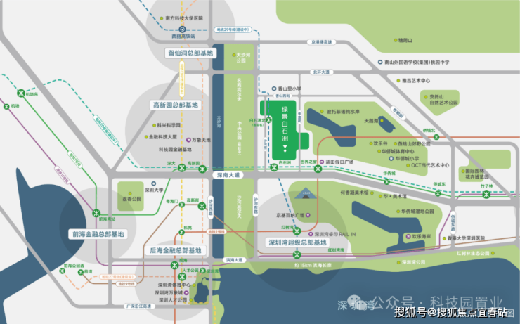 在伦敦、纽约这样的超级城市,其城市主轴的黄金分割点上均屹立着城市超级影响力的项目,如伦敦金丝雀码头、纽约中央公园,而深圳的发展主轴深南大道自东向西,绿景白石洲正处于黄金分割点之上。项目位处城市GDP第一的南山区,深南大道与大沙河科创走廊十字交汇点,代言深圳发展高度。