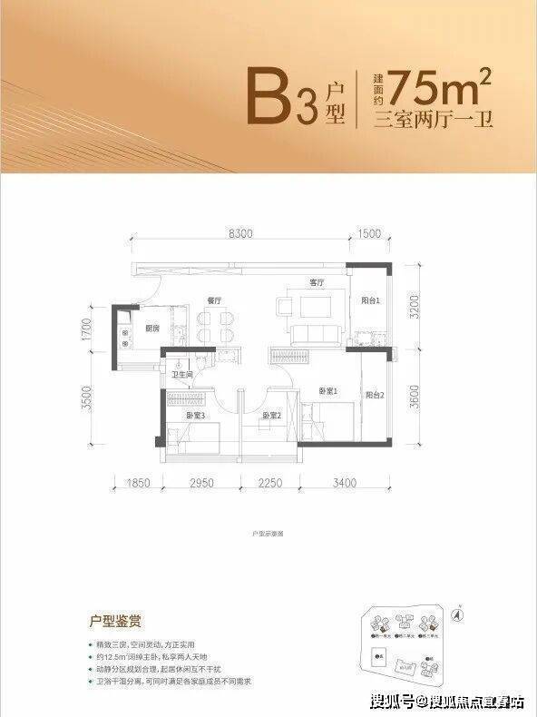 特点:LDKB一体化设计,主卧13.24㎡(含飘窗),次卧8.85㎡(含飘窗),次卧6.75㎡(含飘窗)。