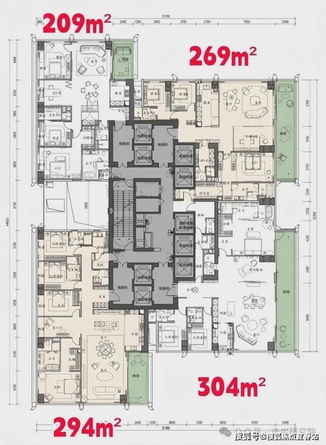 住宅面积约209-269-294-304平,高区约370-375-403平,超高区约500平-700平-1050平