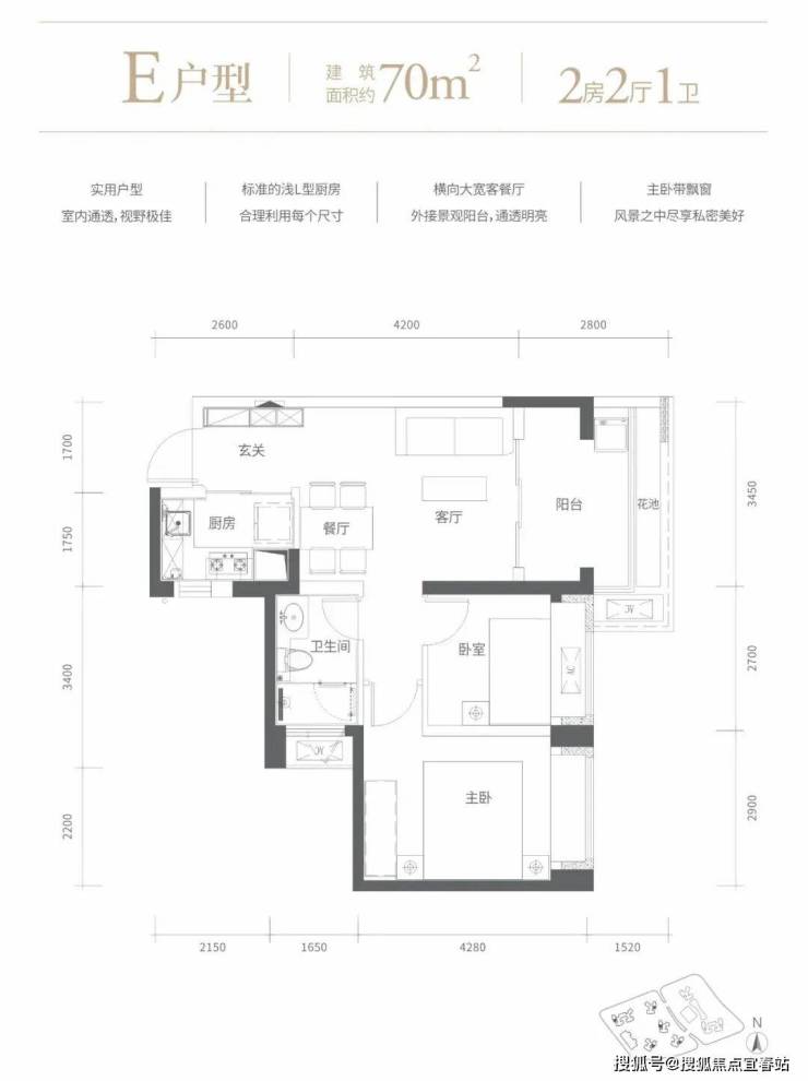 70㎡的2房2厅1卫,设计的是竖厅格局,客厅3.45米开间,进门玄关,LDKB一体化设计,2个卧室分别做到了主卧13.2㎡/次卧8.64㎡(包含墙体飘窗),L型厨房,卫生间干湿分离,得房率72.47%(不含赠送),有朝东向或西向。