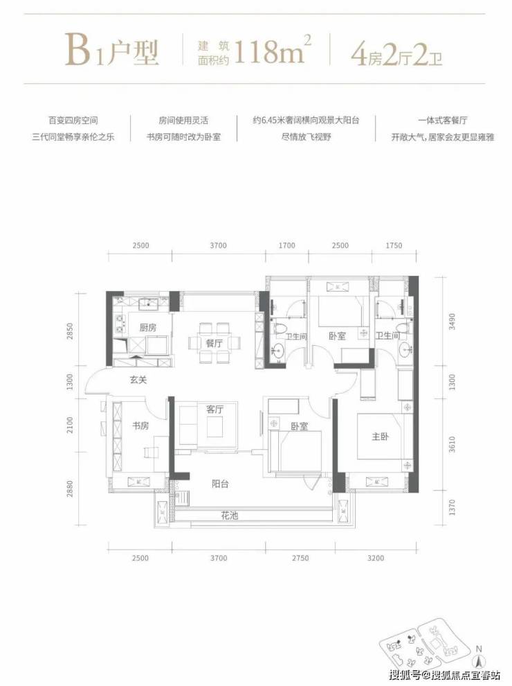 118㎡的4房2厅2卫,设计的是竖厅南北通透格局,客厅3.7米开间,进门玄关,四开间朝南,4个卧室分别做到了主卧15.71㎡/次卧9.02㎡/次卧8.72㎡/次卧8.27㎡(包含墙体飘窗),客厅连接次卧出6.45米长的大阳台,U型厨房,卫生间干湿分离,得房率73.44%(不含赠送),阳台主朝东南或西南向。